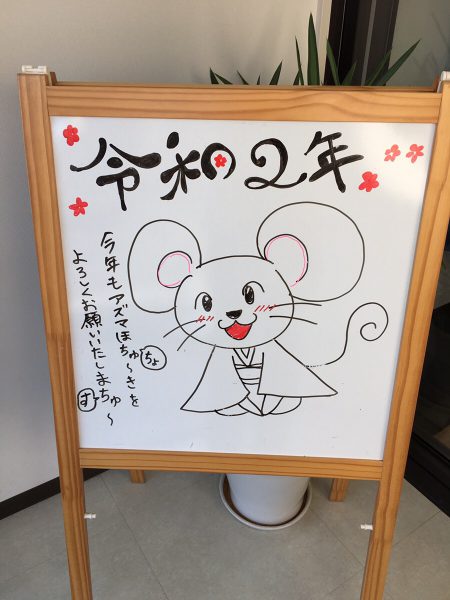 店舗の玄関ボードには、ねずみちゃんイラストを描きました!