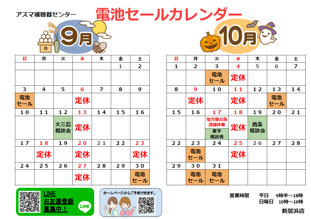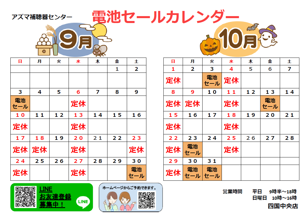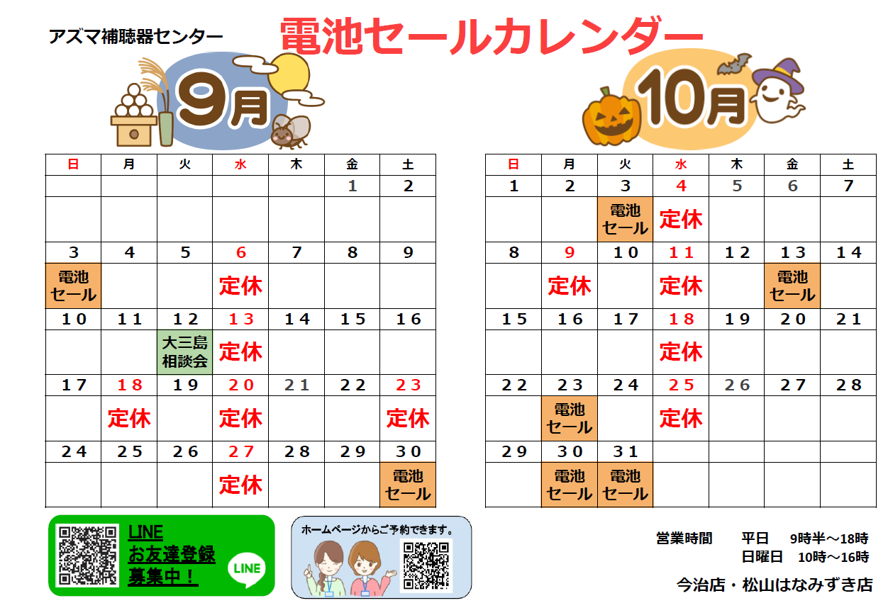 アズマ補聴器センター2023年9月のカレンダー・電池セールのお知らせです。