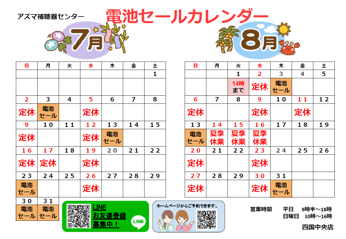 アズマ補聴器センター2023年7月のカレンダー・電池セールのお知らせです。