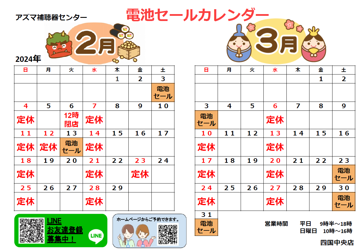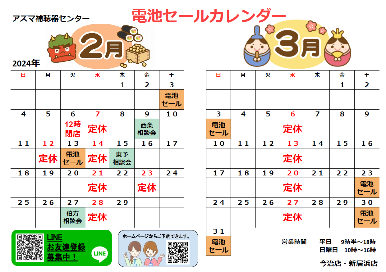 アズマ補聴器センター2024年2月のカレンダー・電池セールのお知らせです。