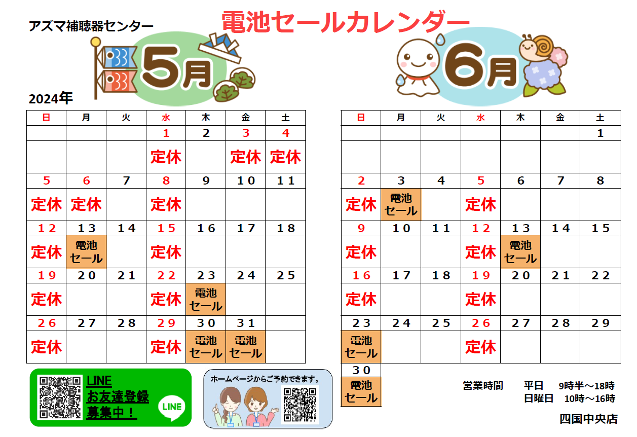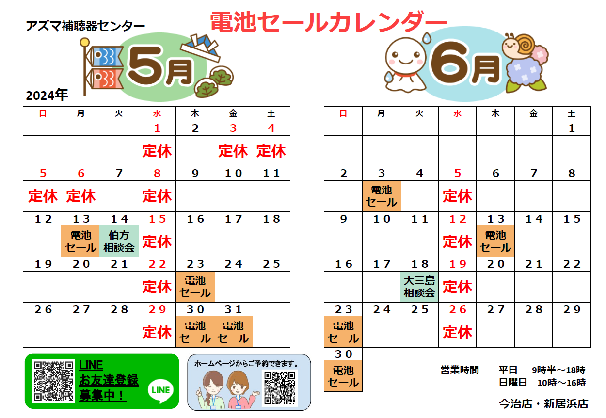 アズマ補聴器センター2024年5月のカレンダー・電池セールのお知らせです。