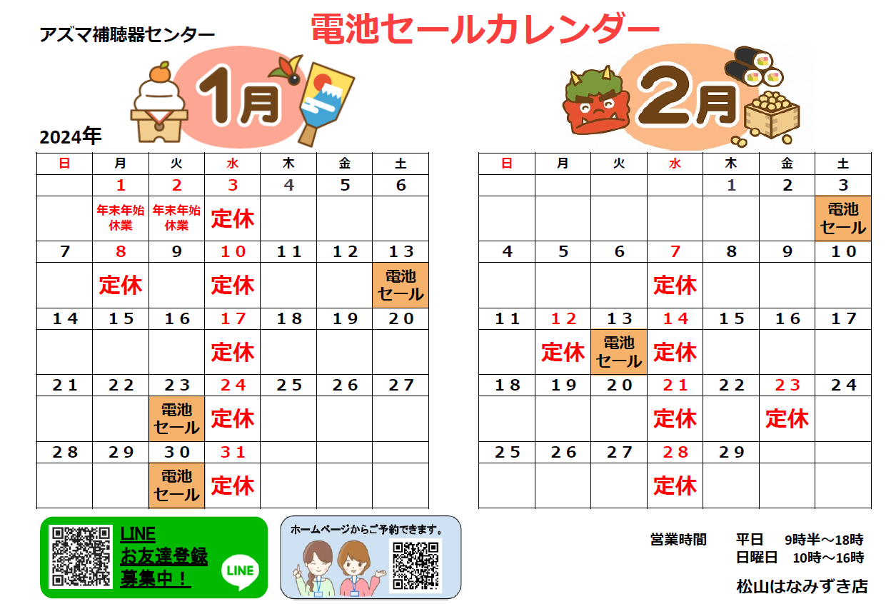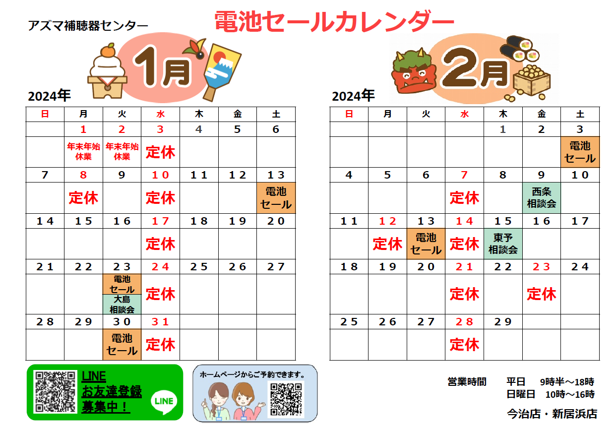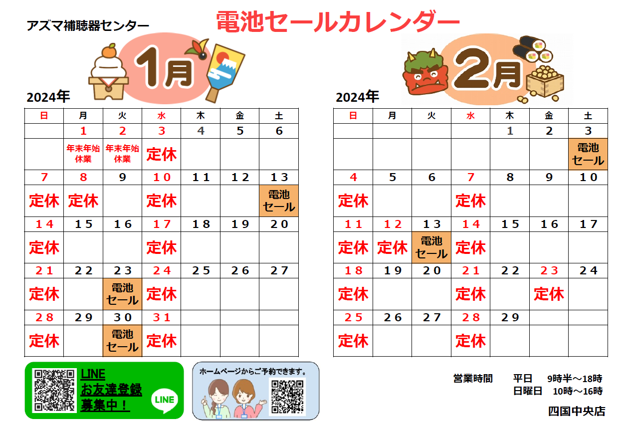 アズマ補聴器センター2024年1月のカレンダー・電池セールのお知らせです。