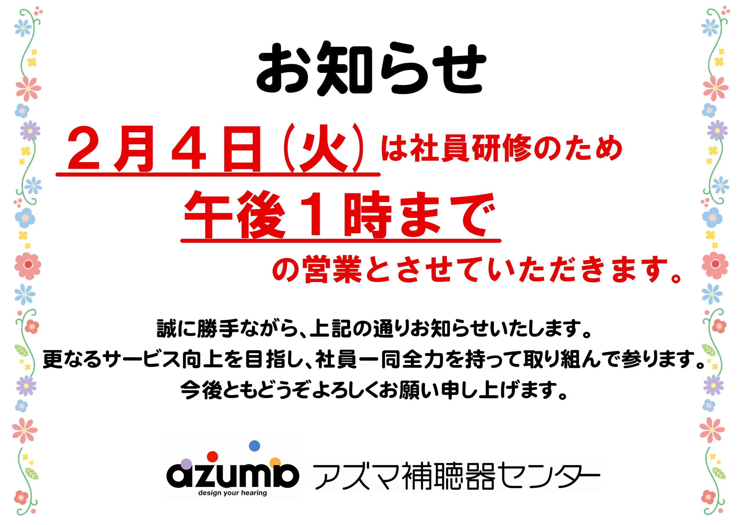2月4日(火)は、社員研修のため全店午後1時で閉店となります。
