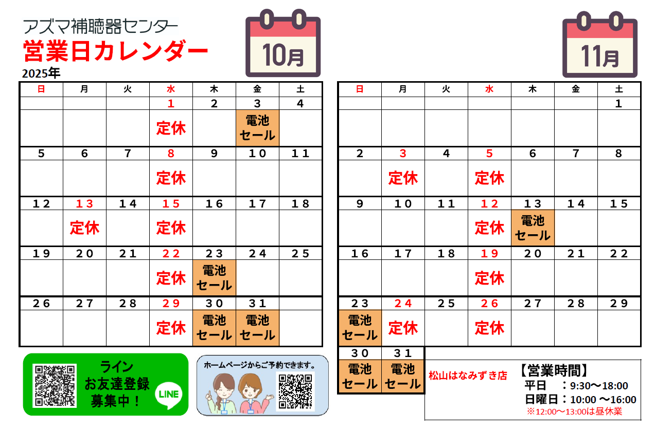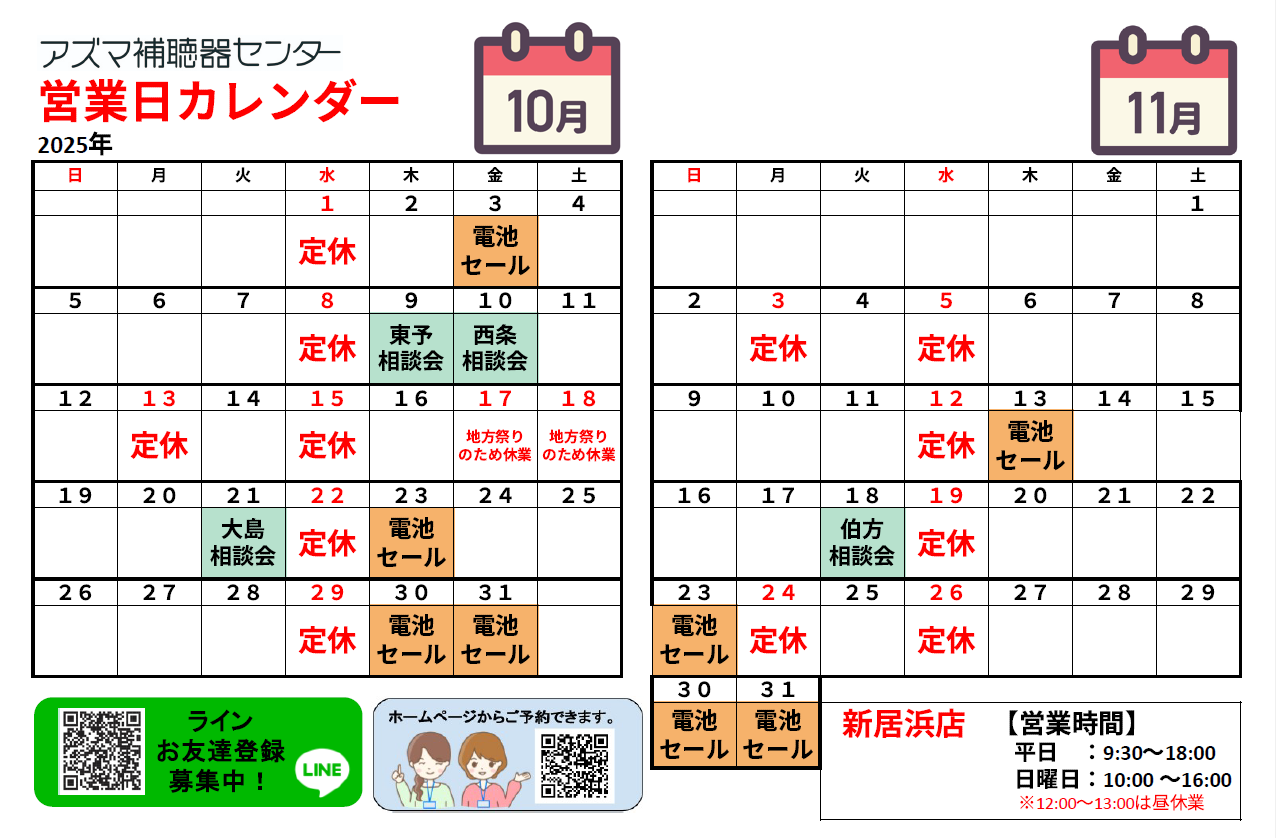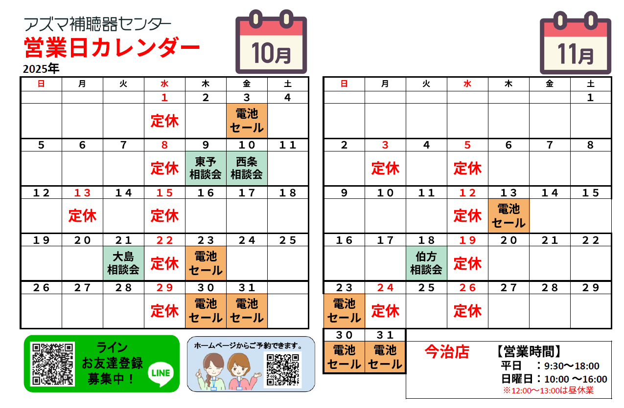 アズマ補聴器センター2025年10月のカレンダー・電池セールのお知らせです。