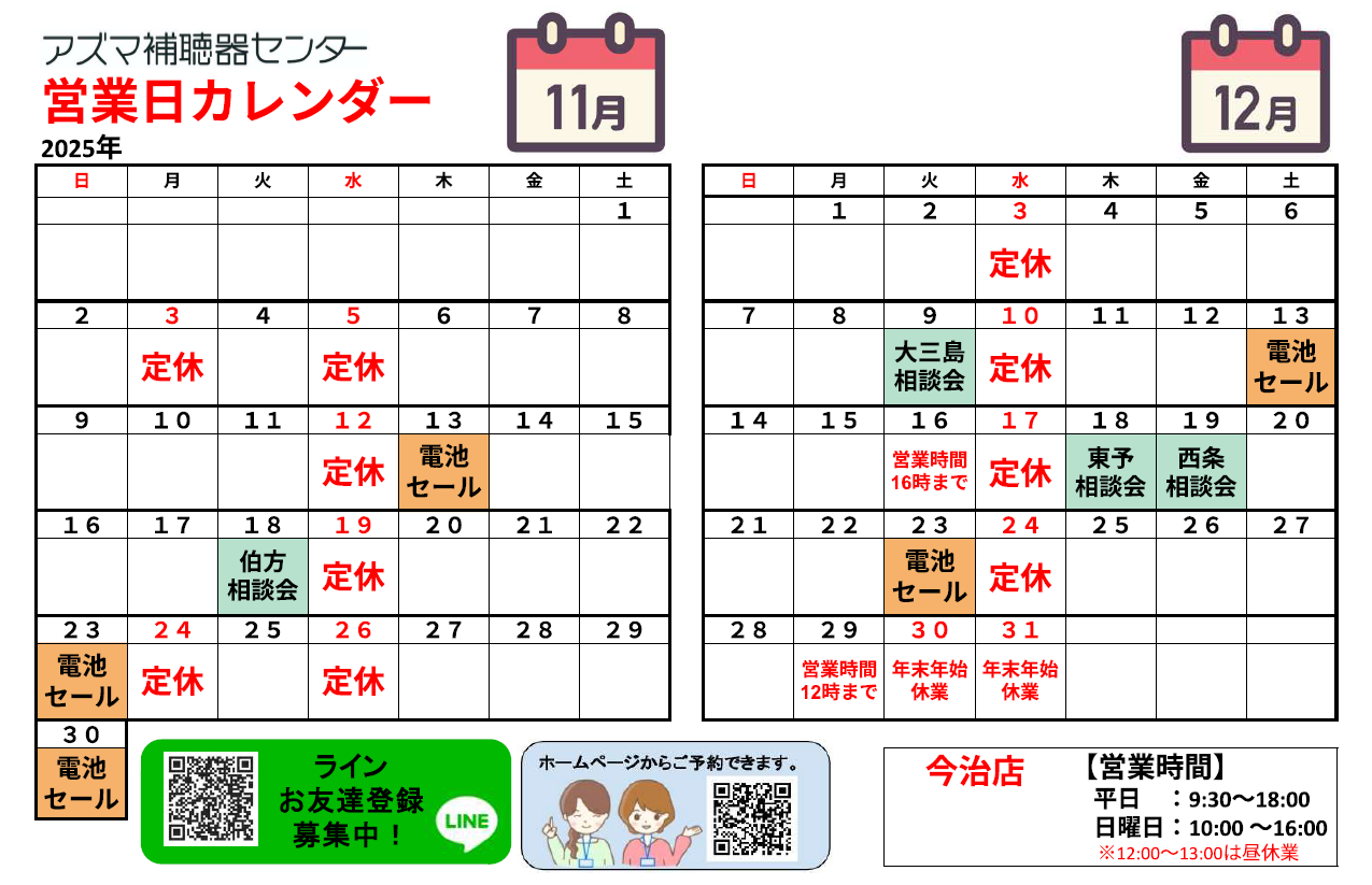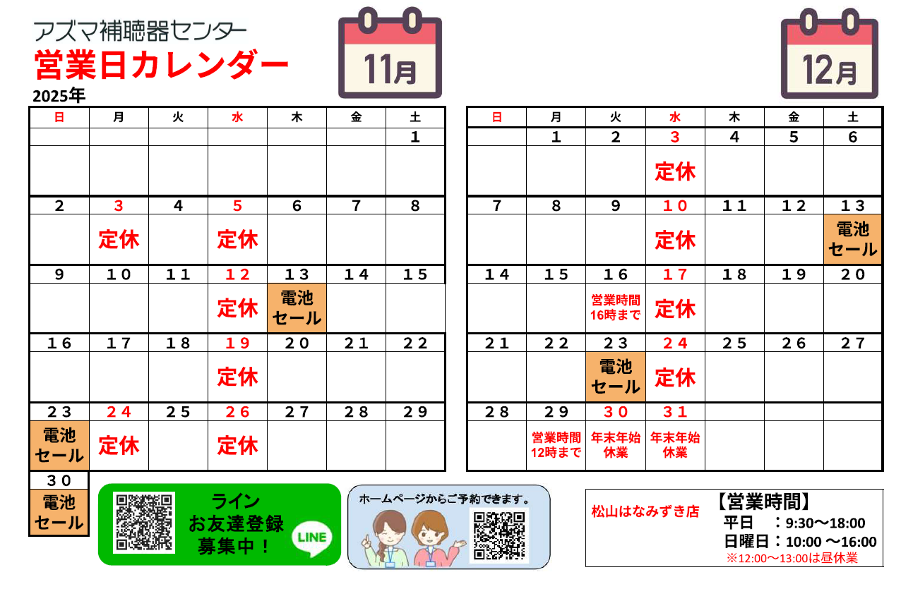 アズマ補聴器センター2025年11月のカレンダー・電池セールのお知らせです。