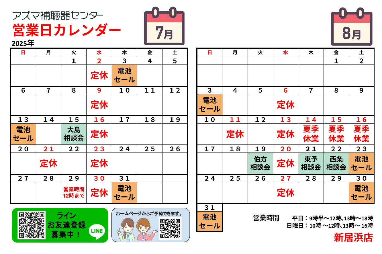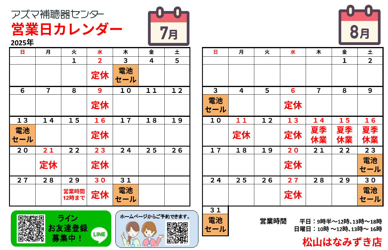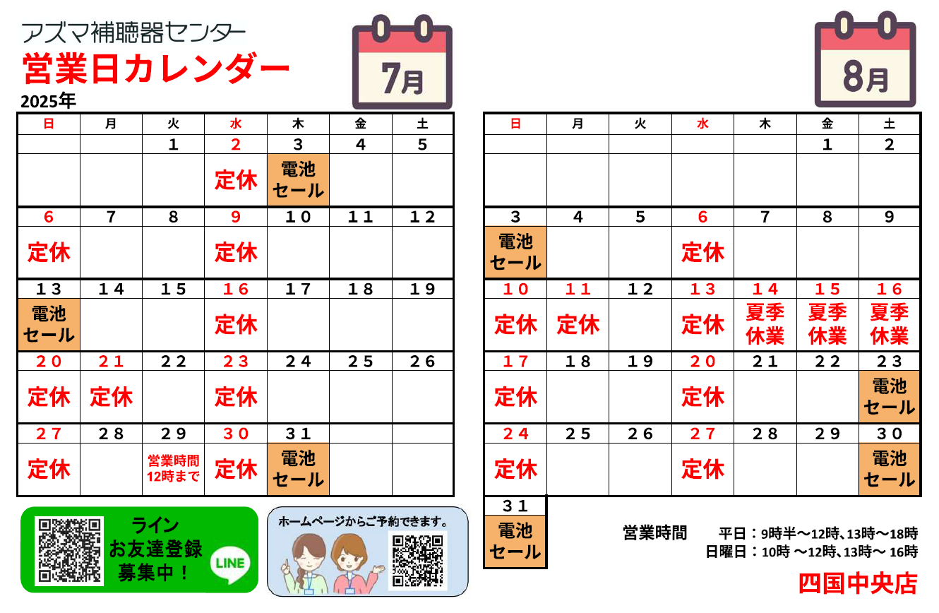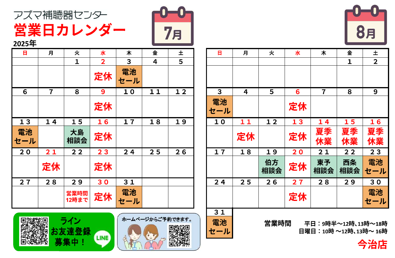 アズマ補聴器センター2025年7月のカレンダー・電池セールのお知らせです。