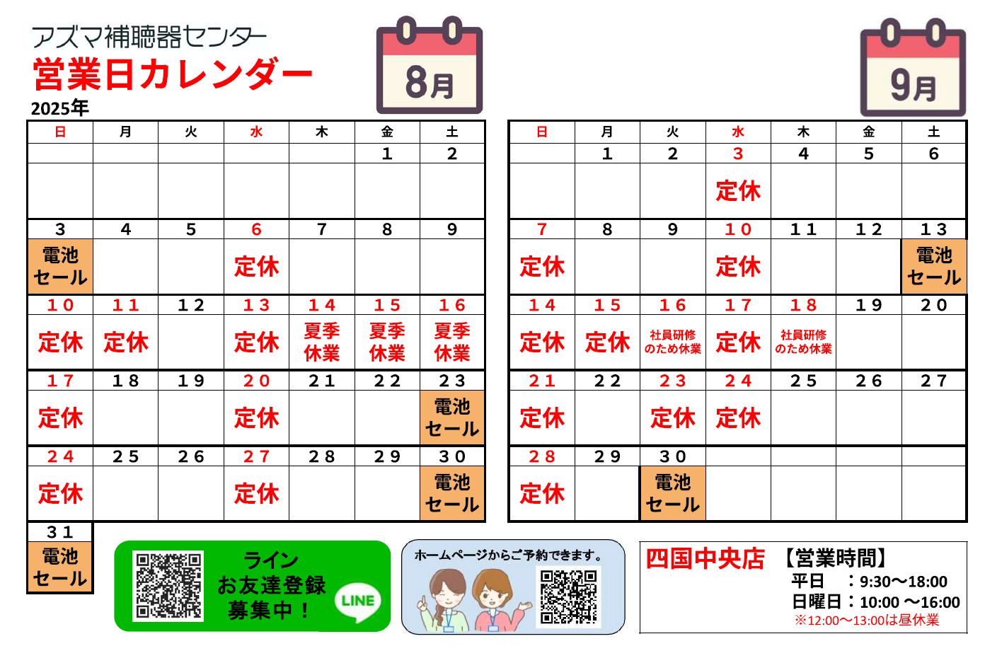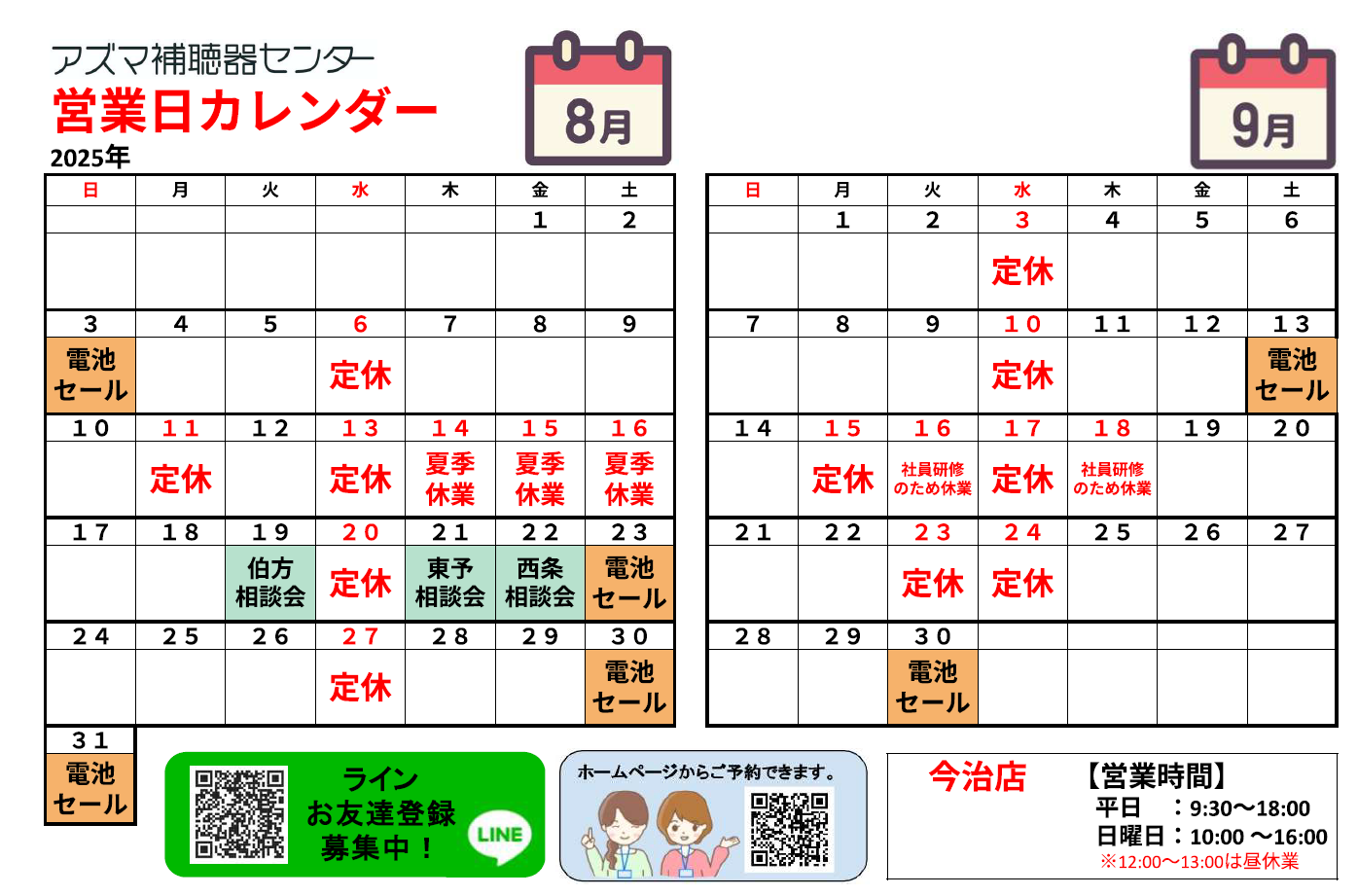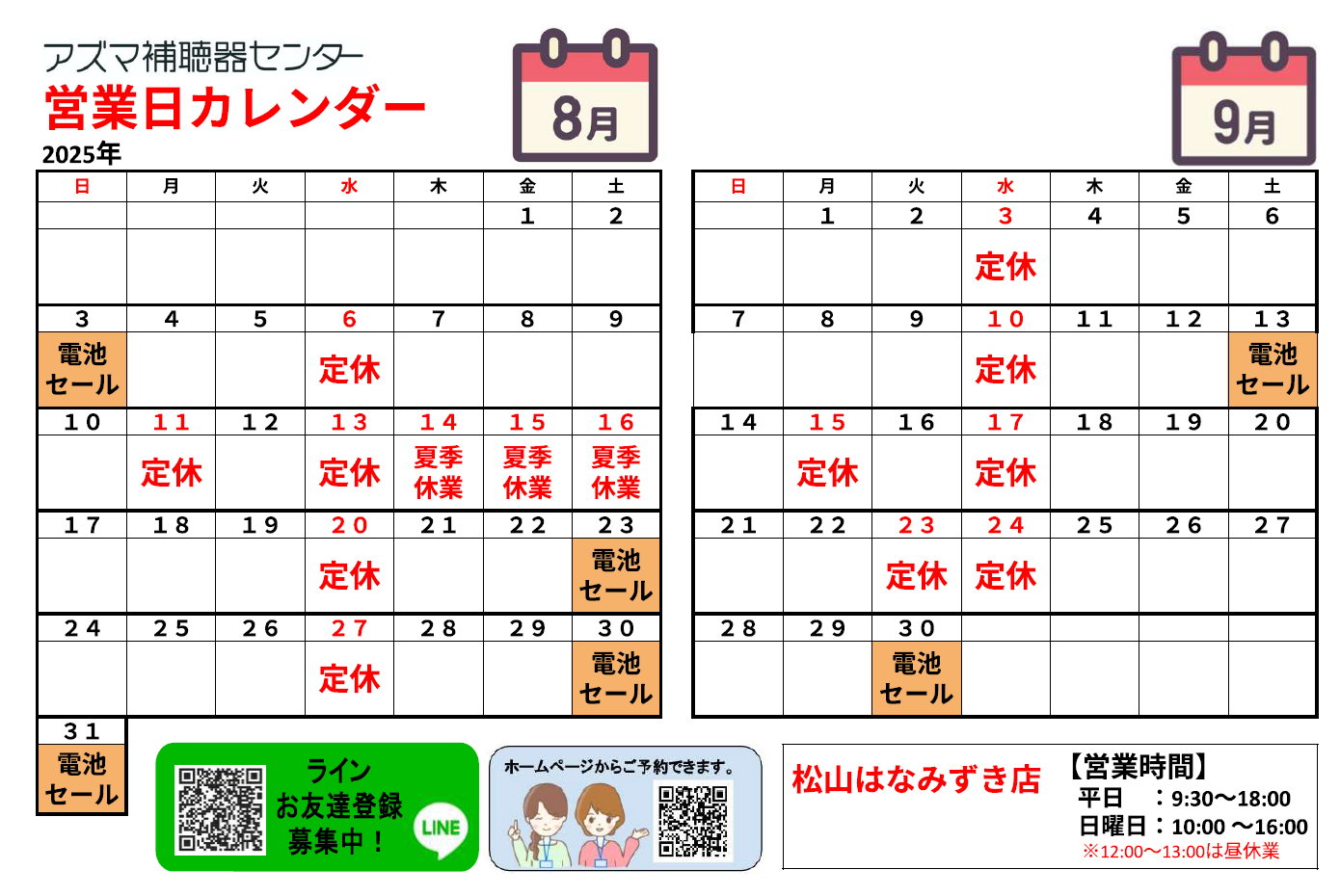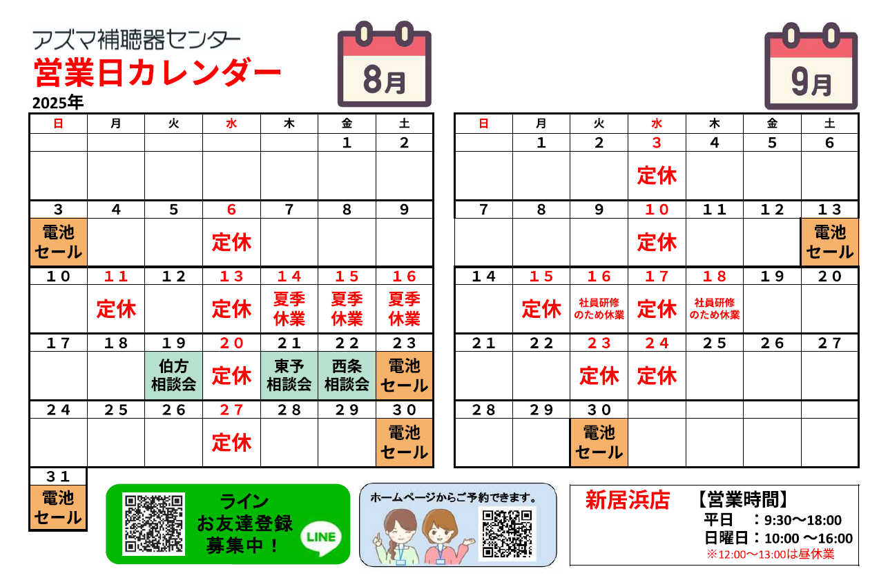 アズマ補聴器センター2025年8月のカレンダー・電池セールのお知らせです。