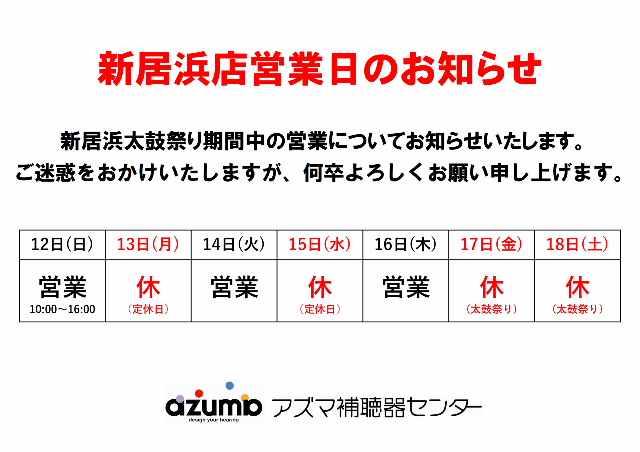 新居浜太鼓祭りの期間の新居浜店の営業日のお知らせです。