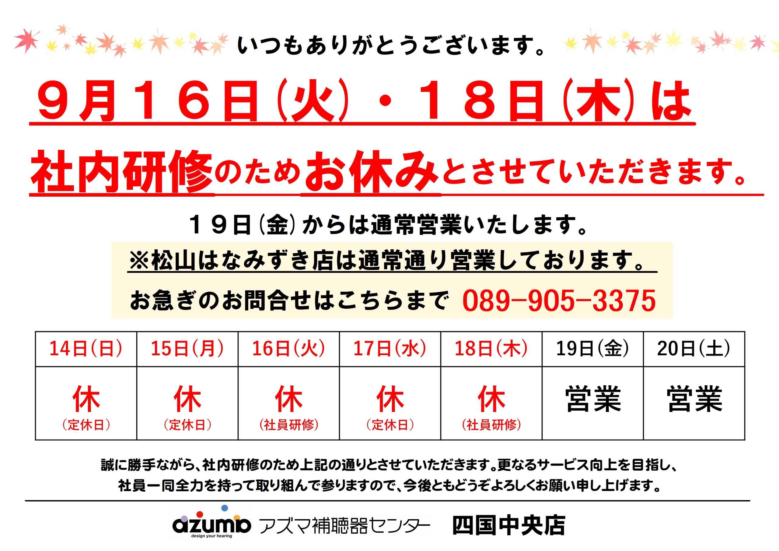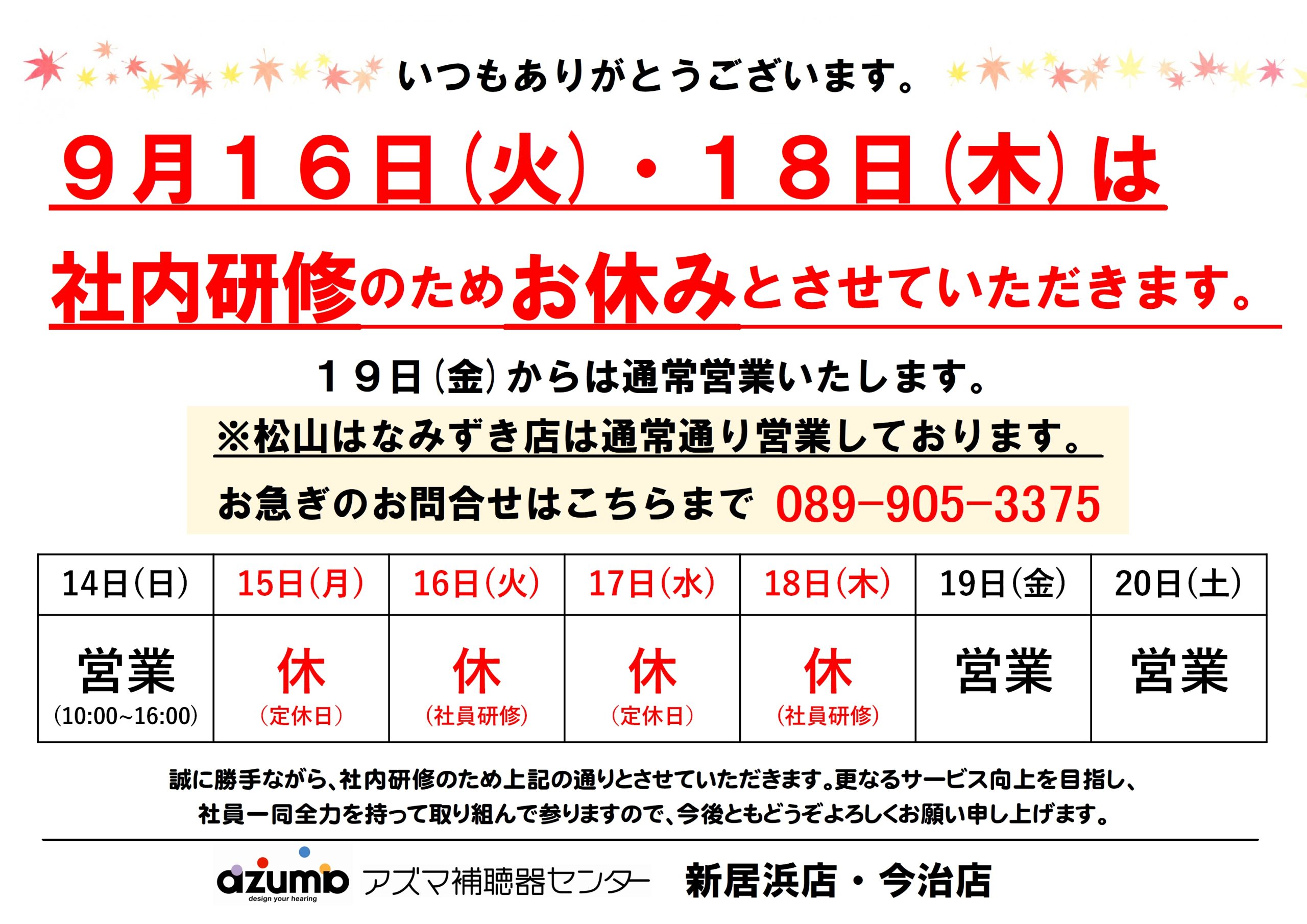 【お知らせ】9月16日・18日は社員研修のためお休みです