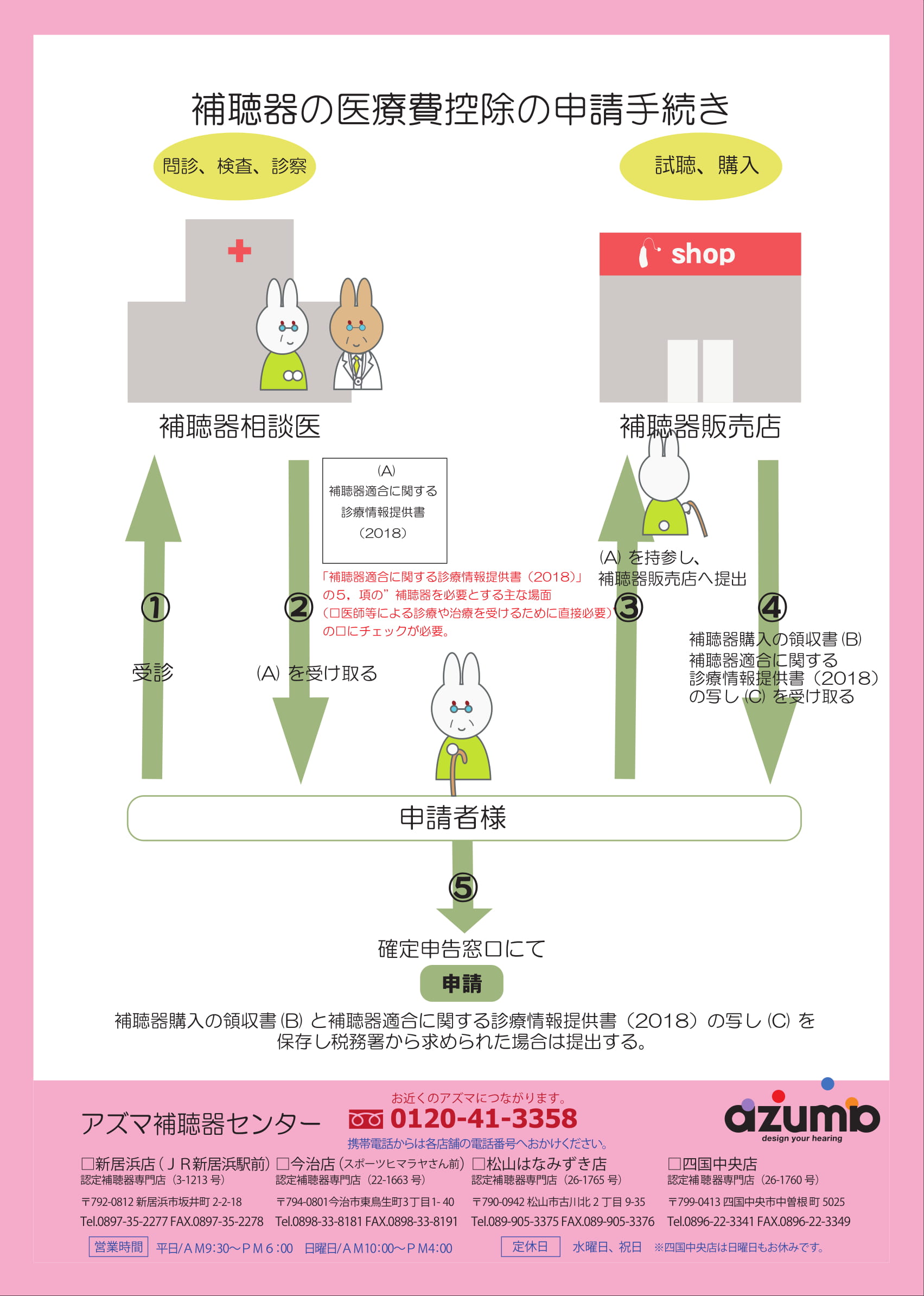 こちらの愛媛県の補聴器相談医リストをご確認いただき、医療費控除の申請をお考えの方はお近くの耳鼻科を受診し診療情報提供書をお持ちの上、ご来店をお願い致します。
