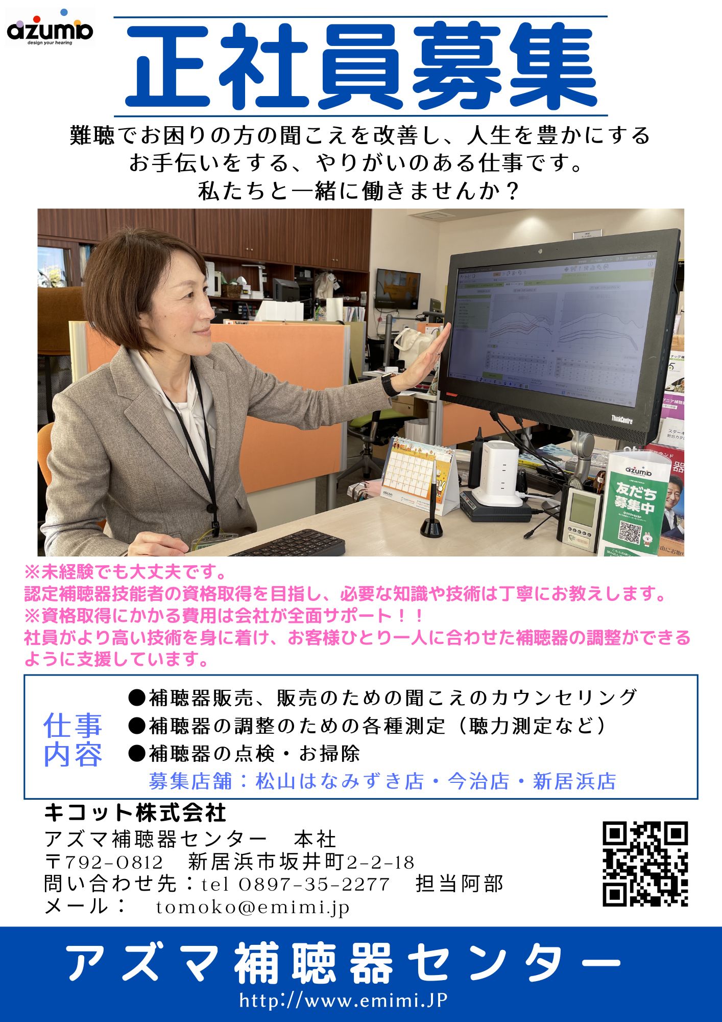 現在、アズマ補聴器センター新居浜店・今治店・松山はなみずき店で社員を募集しています。