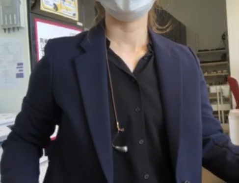 服の襟元にクリップで装着します。